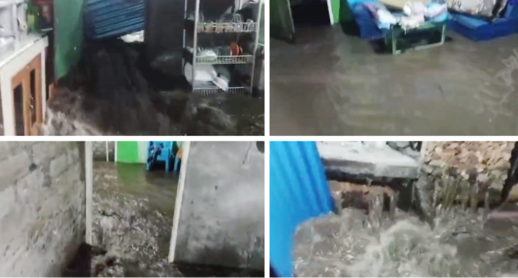 Air masuk ke dalam rumah dengan ketinggian bervariasi, merendam perabotan rumah tangga dan memaksa warga menyelamatkan barang-barang penting di tengah hujan yang masih berlangsung.