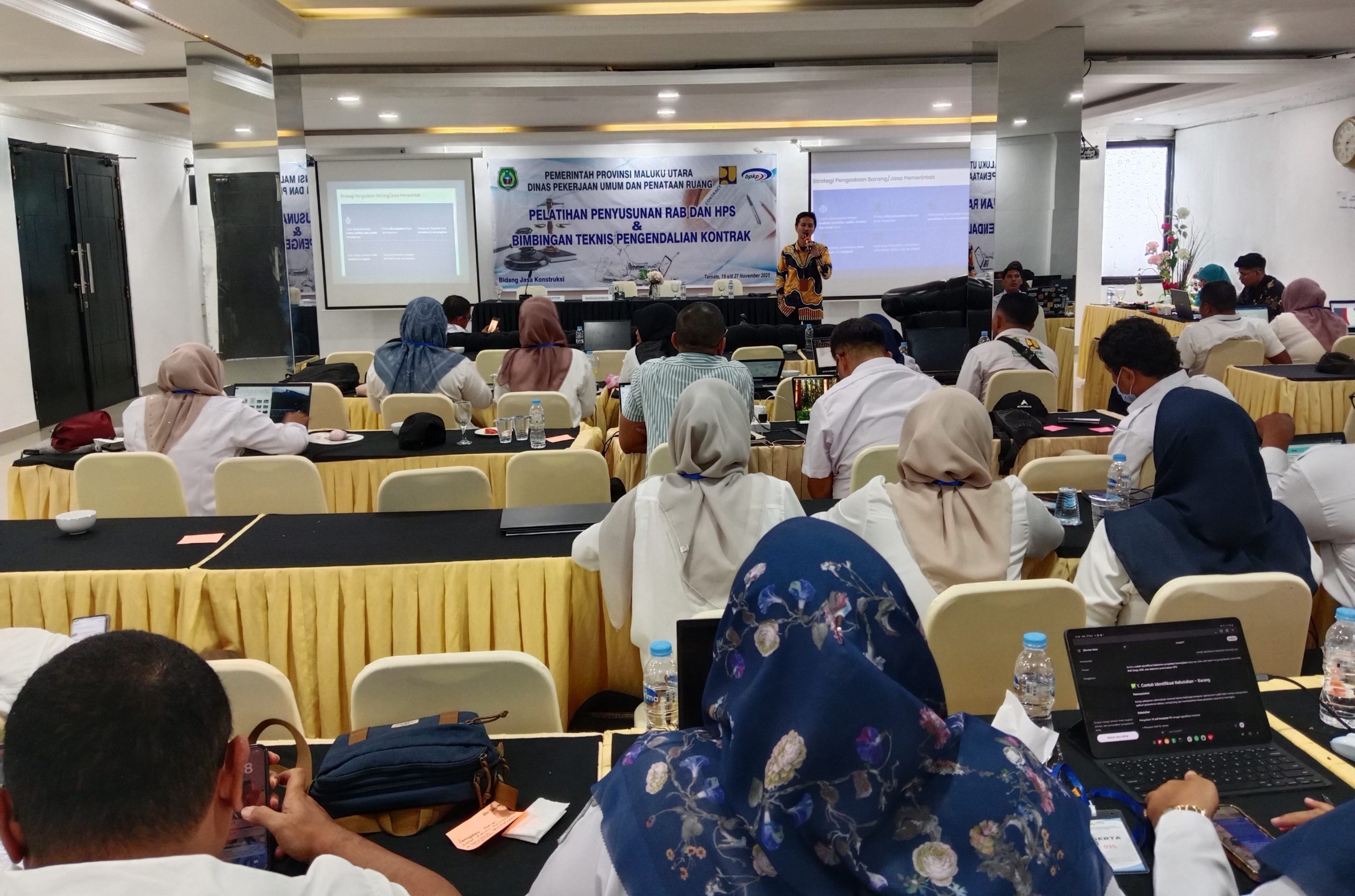 Melalui Bidang Jasa Konstruksi, PUPR Malut menggelar Pelatihan Penyusunan RAB dan HPS serta Bimbingan Teknis Pengendalian Kontrak yang berlangsung di Safirna Hotel.